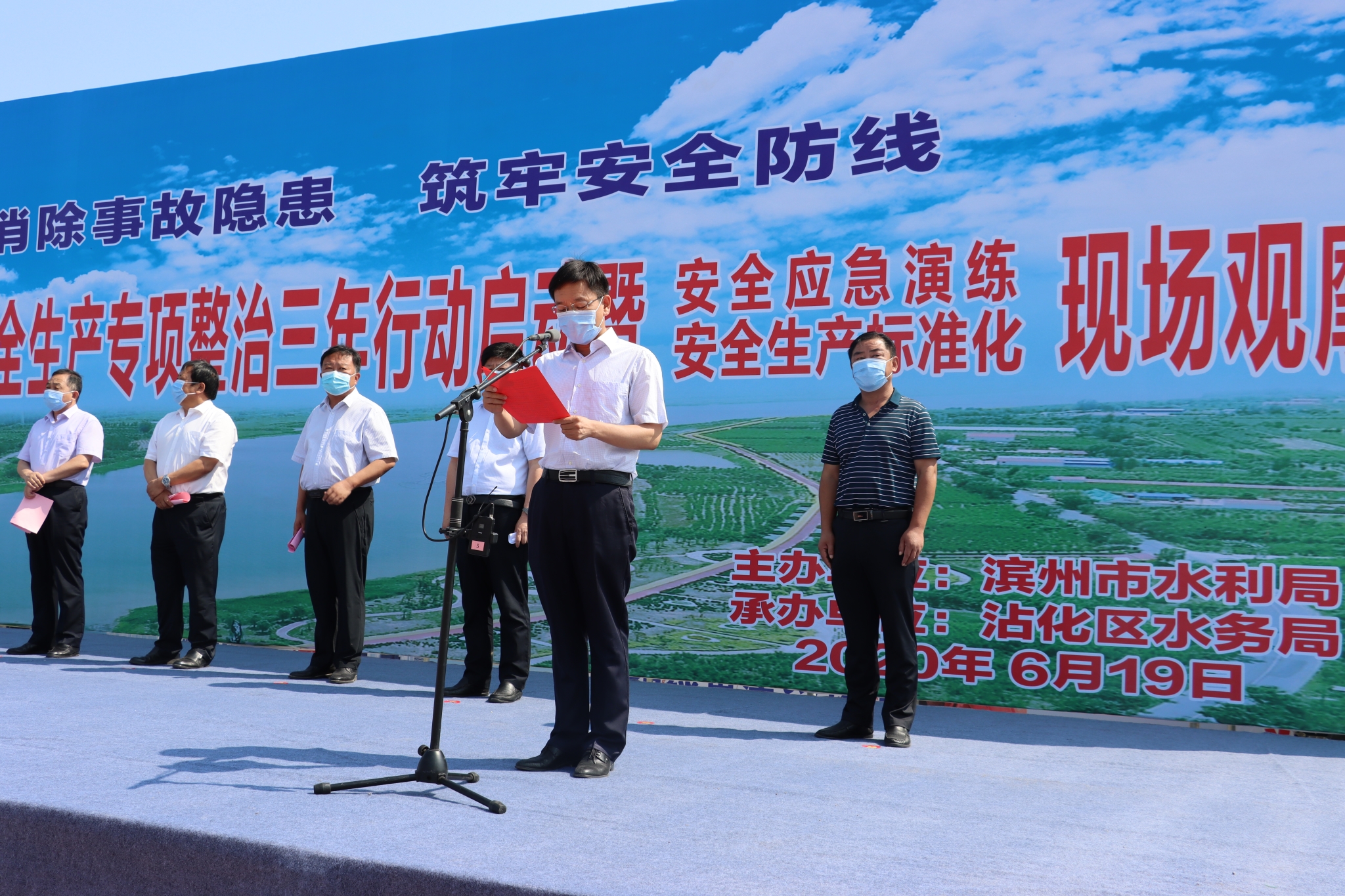 為了深入貫徹落實習近平總書記對安全生產的重要指示批示精神,結合全國第19個安全生產月,6月19日上午,2020年全市水利行業安全生產專項整治三年行動啟動暨安全應急演練安全生產標準化現場觀摩會在沾化區秦口河除險加固工程安全標準化工地召開,市水利局、各縣區水利局、濱州市水利資源開發建設中心、市引黃灌溉管理服務中心、市水利工程處、市水利設計院等水利行業部門負責人共200余人參加。
